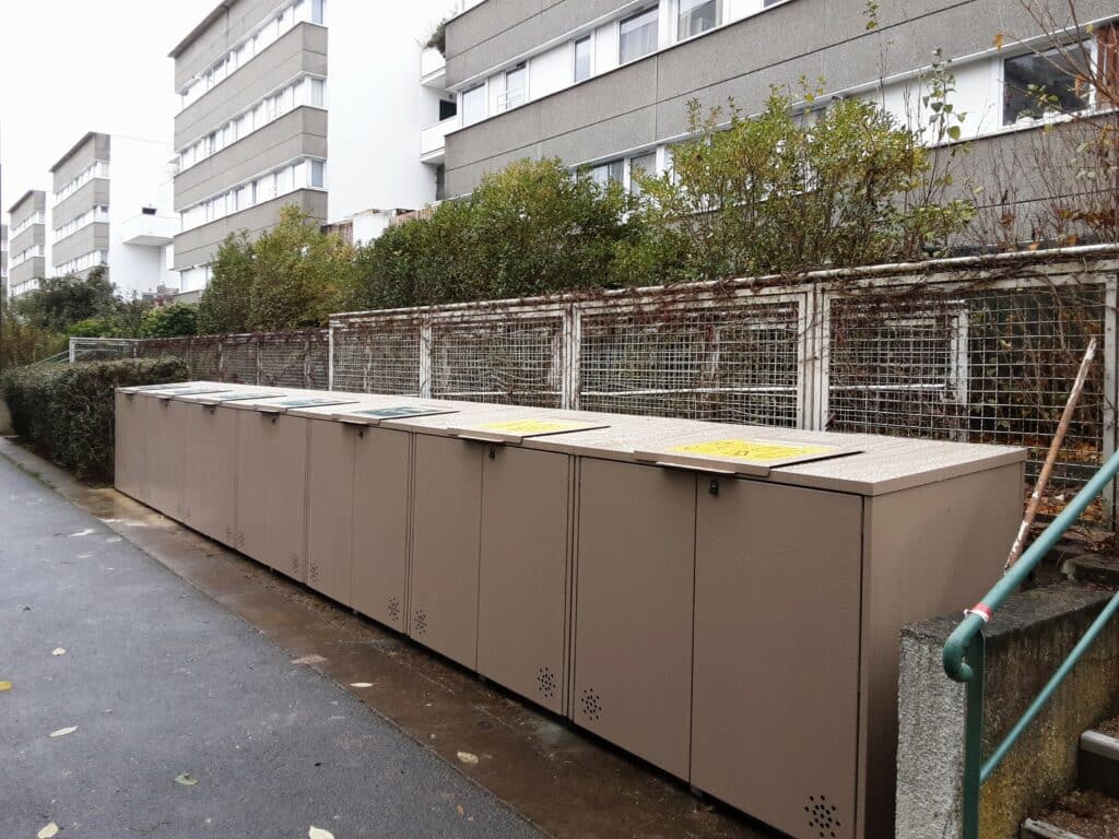 La solution retenue a été l’installation d’abris bacs du modèle Bonnos, dimensionnés pour accueillir de grands volumes de déchets afin que tous les habitants puissent y accéder quotidiennement, même dans une zone à forte densité. Leur design épuré et leur conception robuste en font des équipements faciles d’usage, adaptés aux environnements urbains et fréquentés. Les trappes d’introduction, conçues pour permettre le dépôt de sacs allant jusqu’à 100 litres, assurent une manipulation simple et rapide pour tous les usagers. Pour faciliter encore davantage le tri, Abri Plus a ajouté sur chaque trappe des pictogrammes visuels représentant les déchets acceptés. Ces repères graphiques, immédiatement compréhensibles même pour les personnes ne sachant pas lire le français, ont été décisifs pour fluidifier les dépôts, réduire les erreurs et inciter au tri.