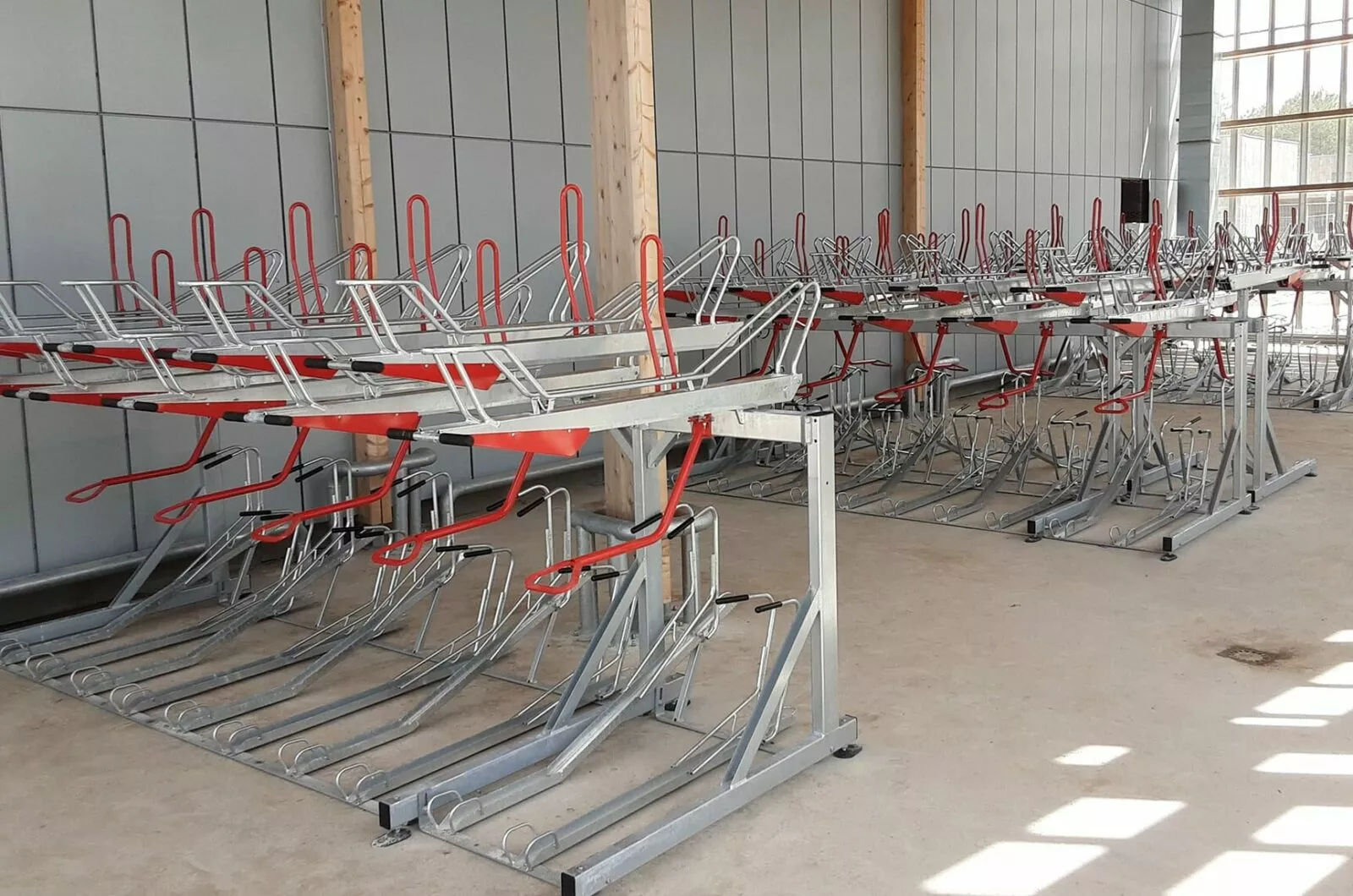 The double-deck rack can be installed in an open or enclosed bike shelter.