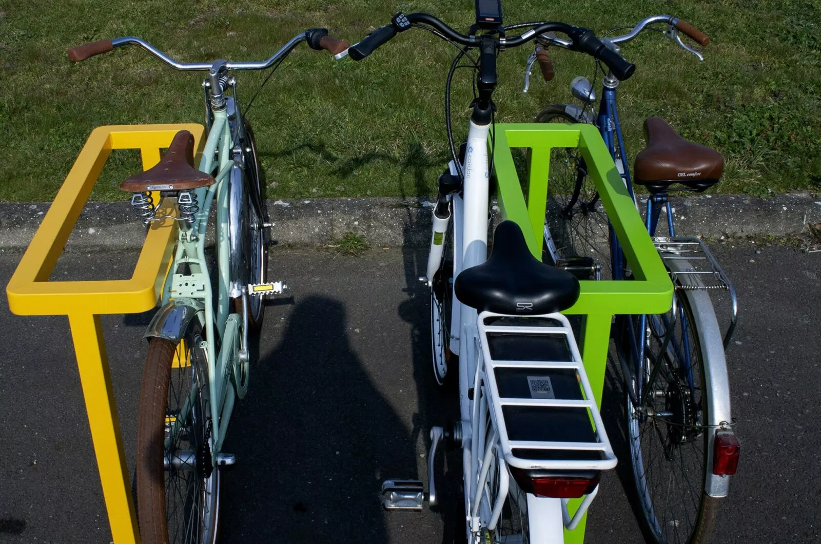 The O bike stand is a stylish, ergonomic bike stand designed for easy parking of two bikes. Ideally placed under a bike shelter, it prevents the handlebars of the bikes from colliding.