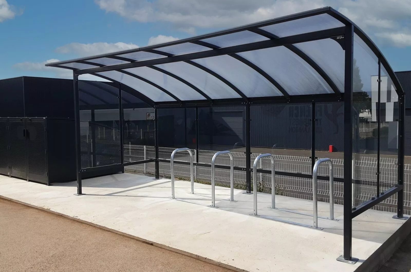 The top-of-the-range Grand Lieu open bike shelter features rounded, contemporary lines. Litter garbage cans and signage bring comfort and visibility to this bicycle parking facility.