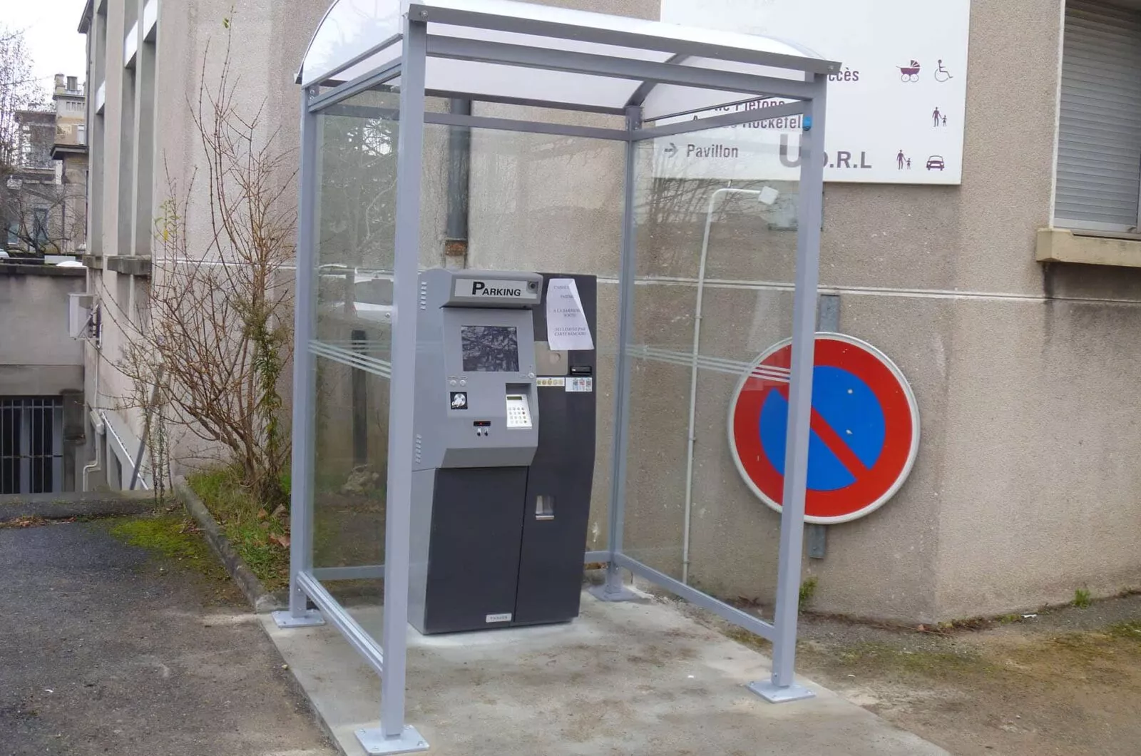 The sober design of the pay station shelter can be complemented with litter garbage cans and lighting kits for user comfort. Silk-screen printing can be added to the shelter’s spandrels.