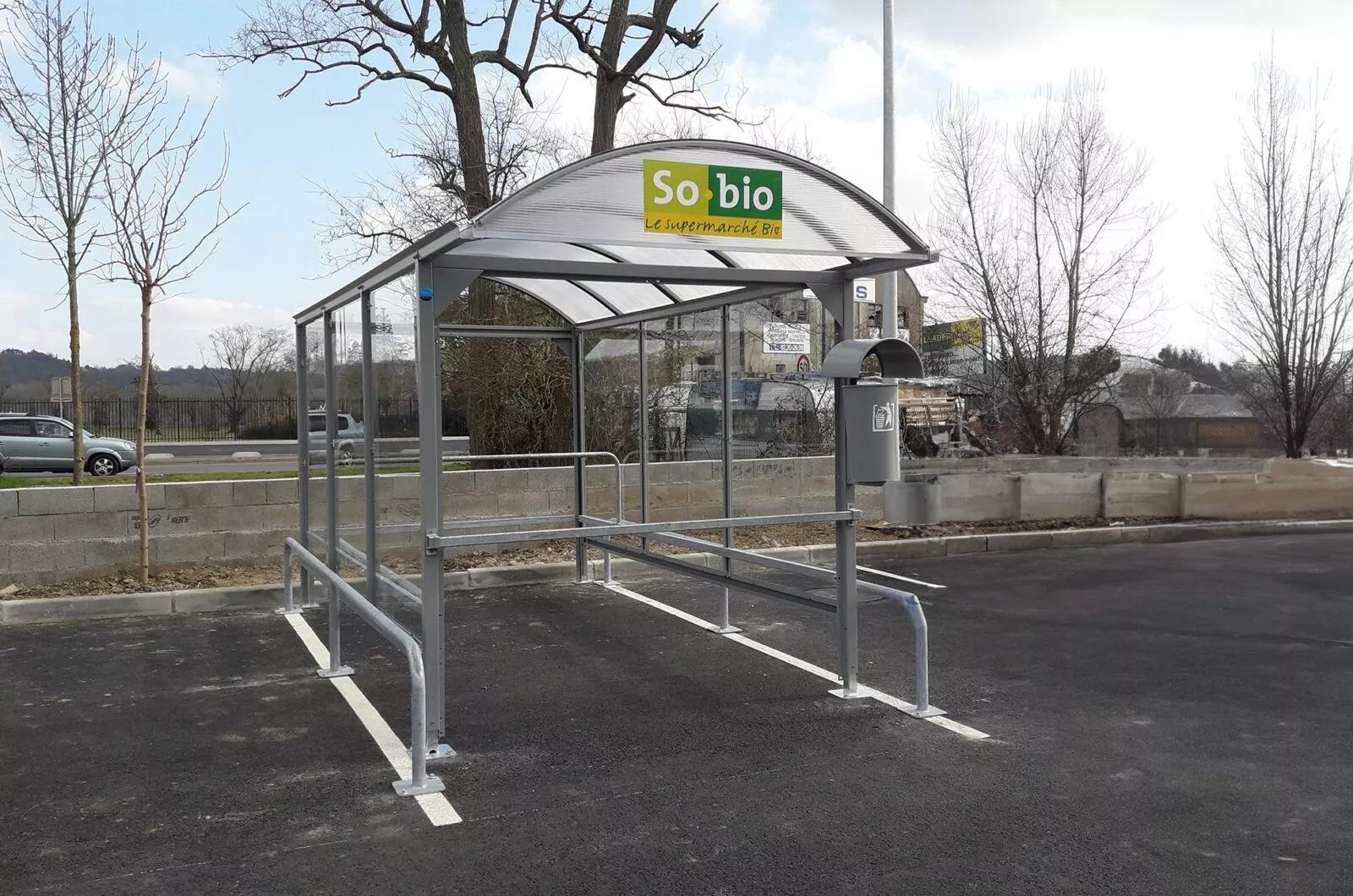 Several options are available to complete thecaddy shelter: ballast bases, post protectors, lane limiters, litter garbage cans and customized spandrels.