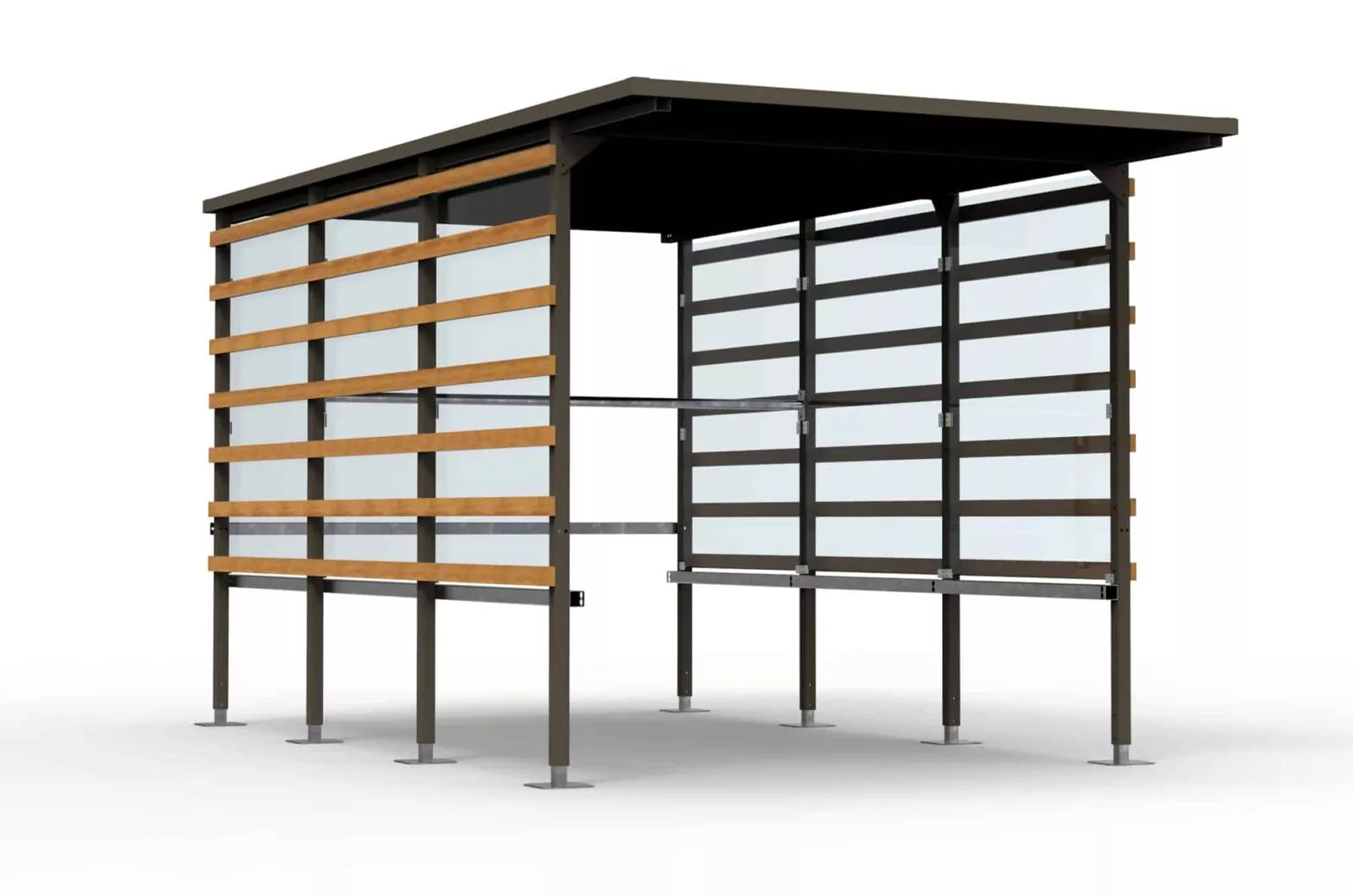 In the Economique range, the TP50 trolleyshelter offers rain protection at the best price. With its flat roof and trendy cladding, the TP 50 glass and wood shelter blends seamlessly into its surroundings.