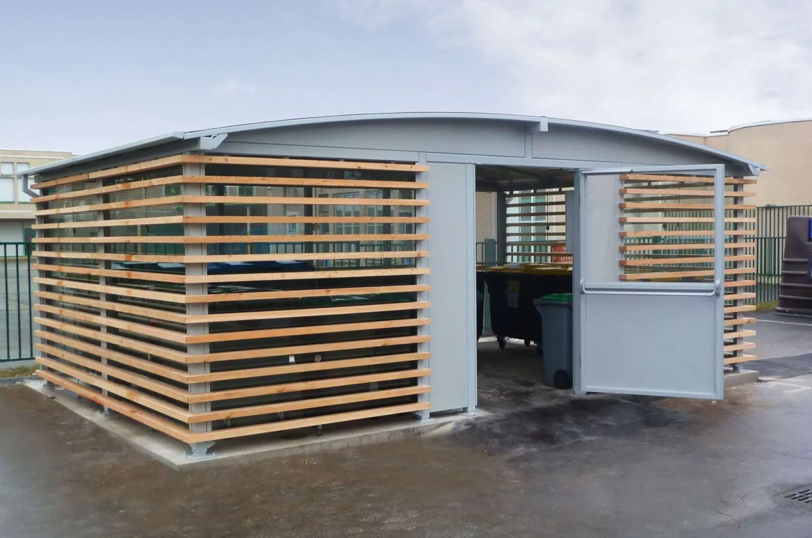 Modular, it is available in flat roof or curved roof versions, and can be infinitely extended in 2m blocks… This garbage can cover can be completed with options such as access management and lighting with presence detector.