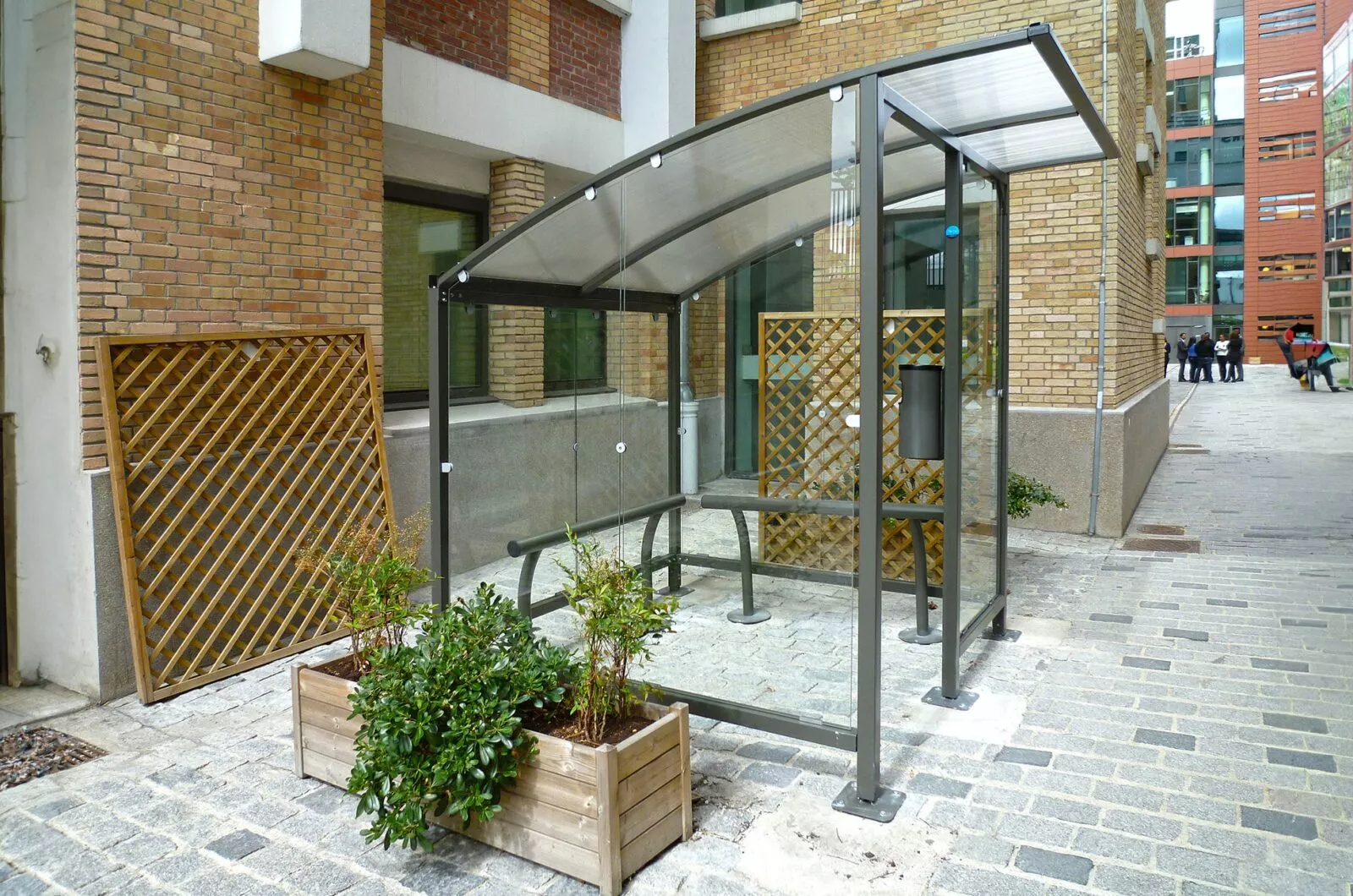 Elrefugio para fumadores de gama alta Grand Lieu destaca por su elegante diseño. Este recinto para fumadores de exterior es modular: puede tener 2,50 m o 4,00 m de largo.