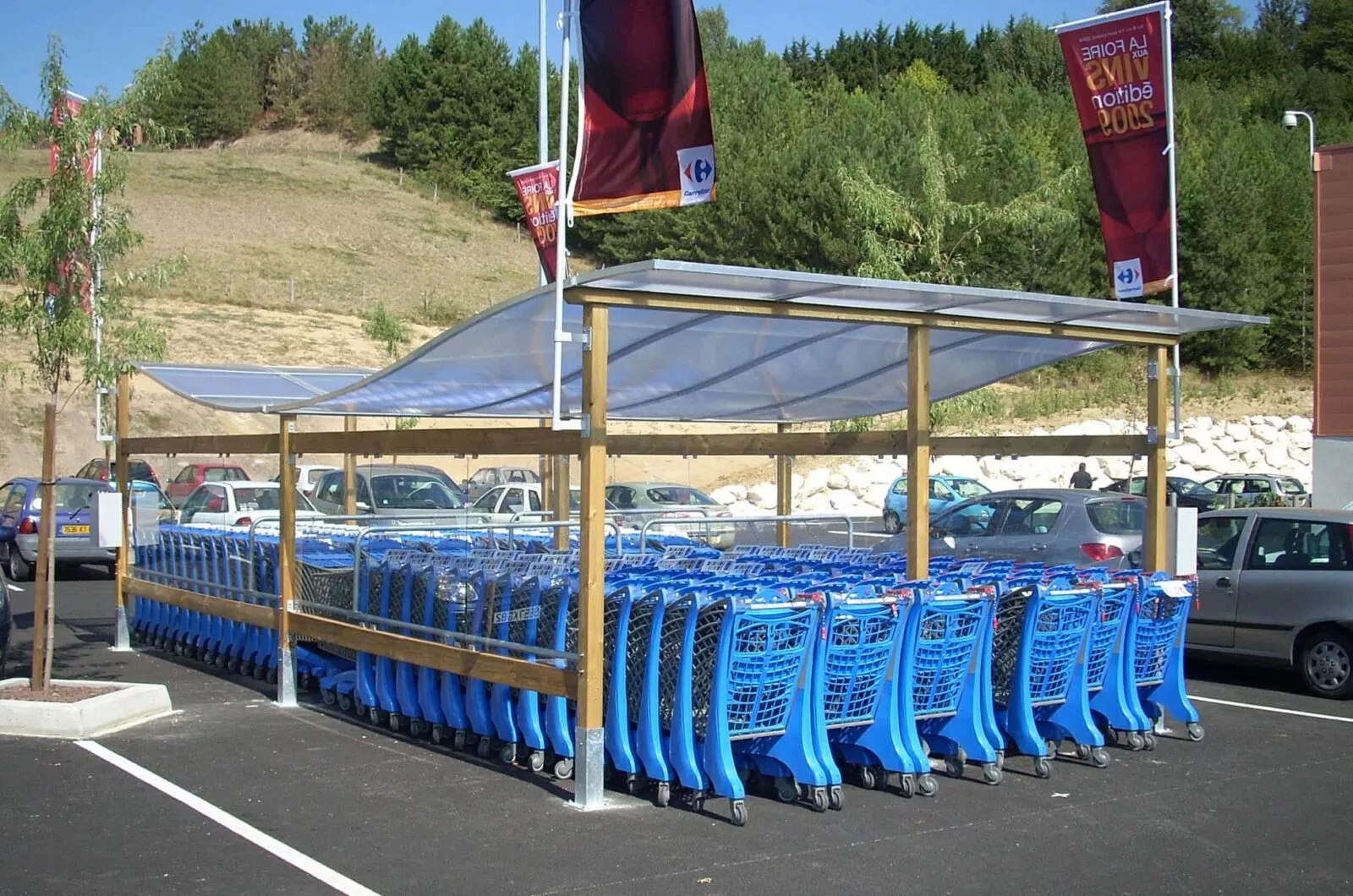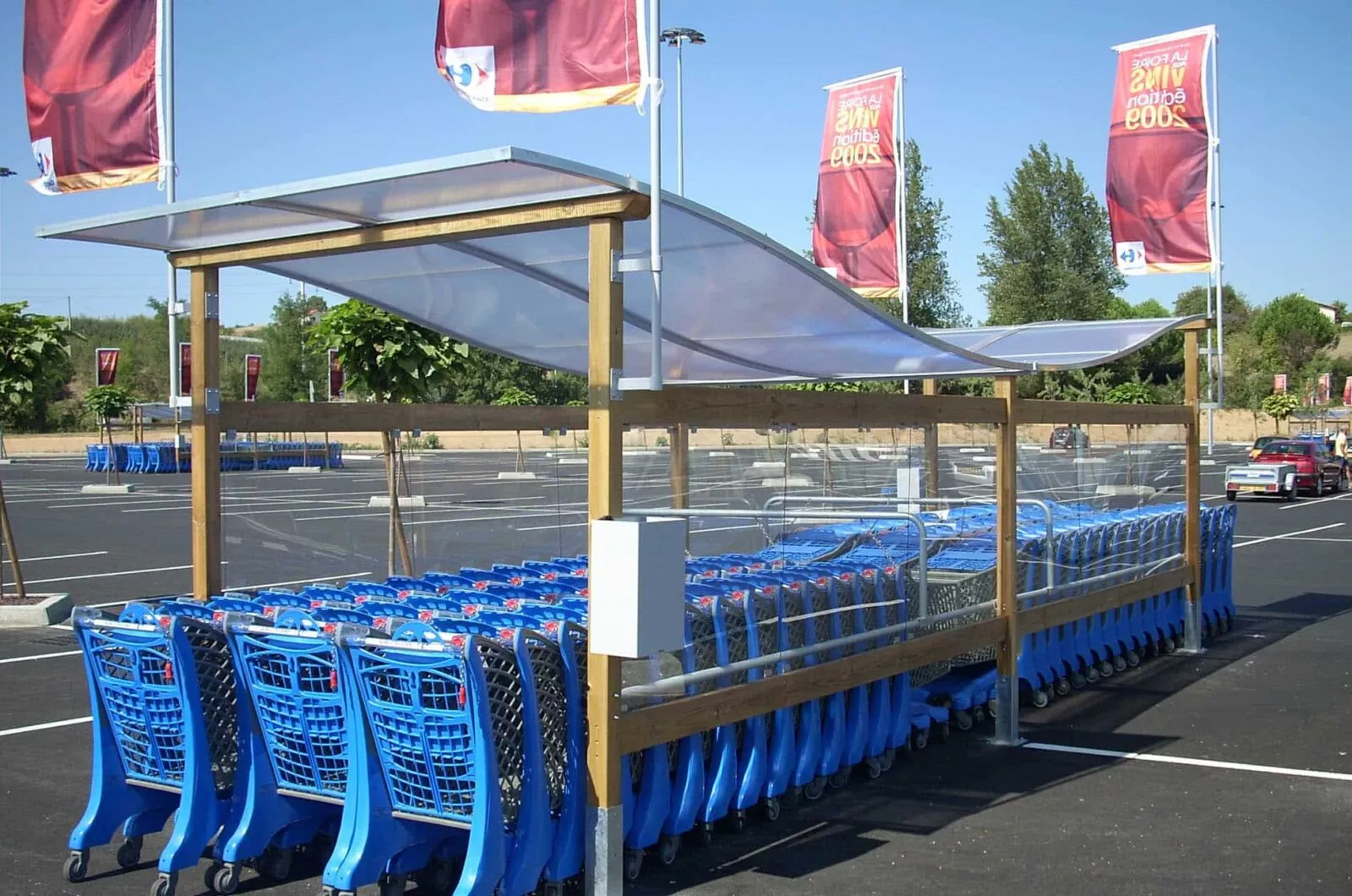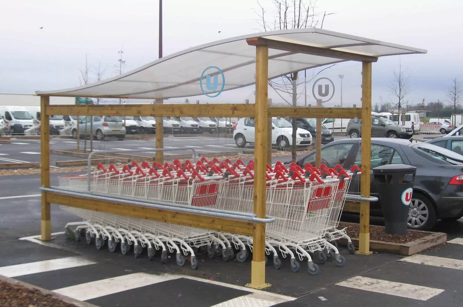 Dans la gamme Bois, l’abri chariots GV Bois associe une structure bois avec une toiture originale, une toiture vague.