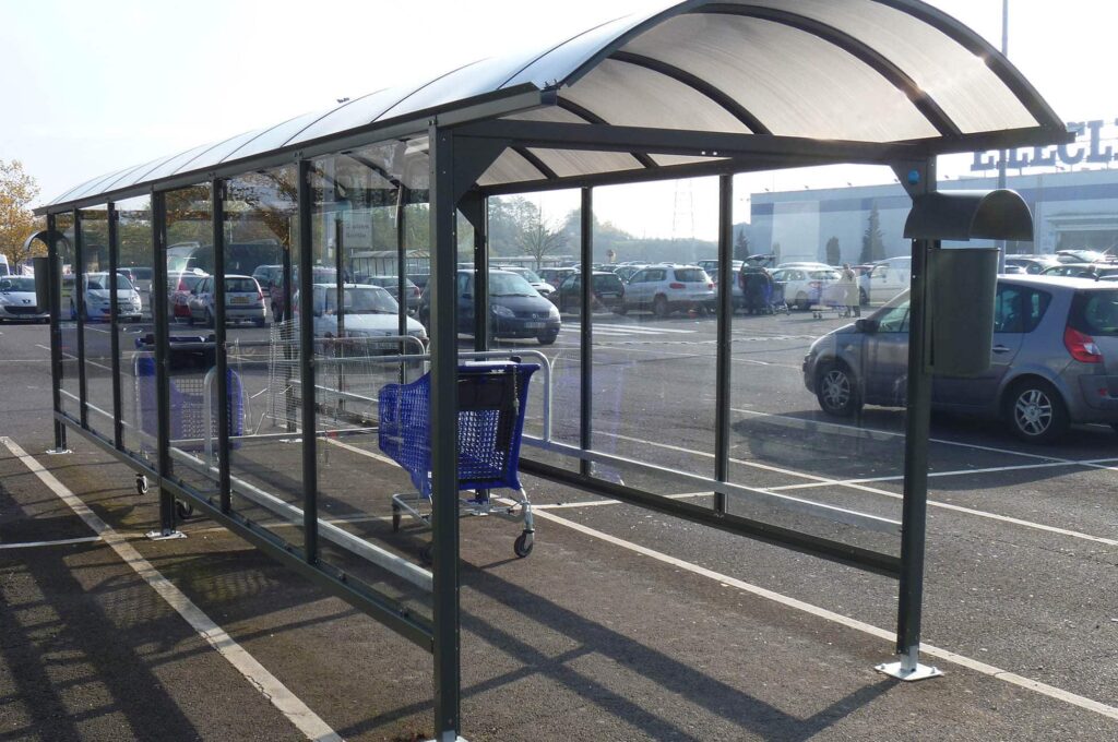 Plusieurs options sont proposées pour compléter l’abri caddies : des bases de lestage, des protections de poteaux, des limiteurs de files, des corbeilles de propreté ou encore de la personnalisation de tympan.