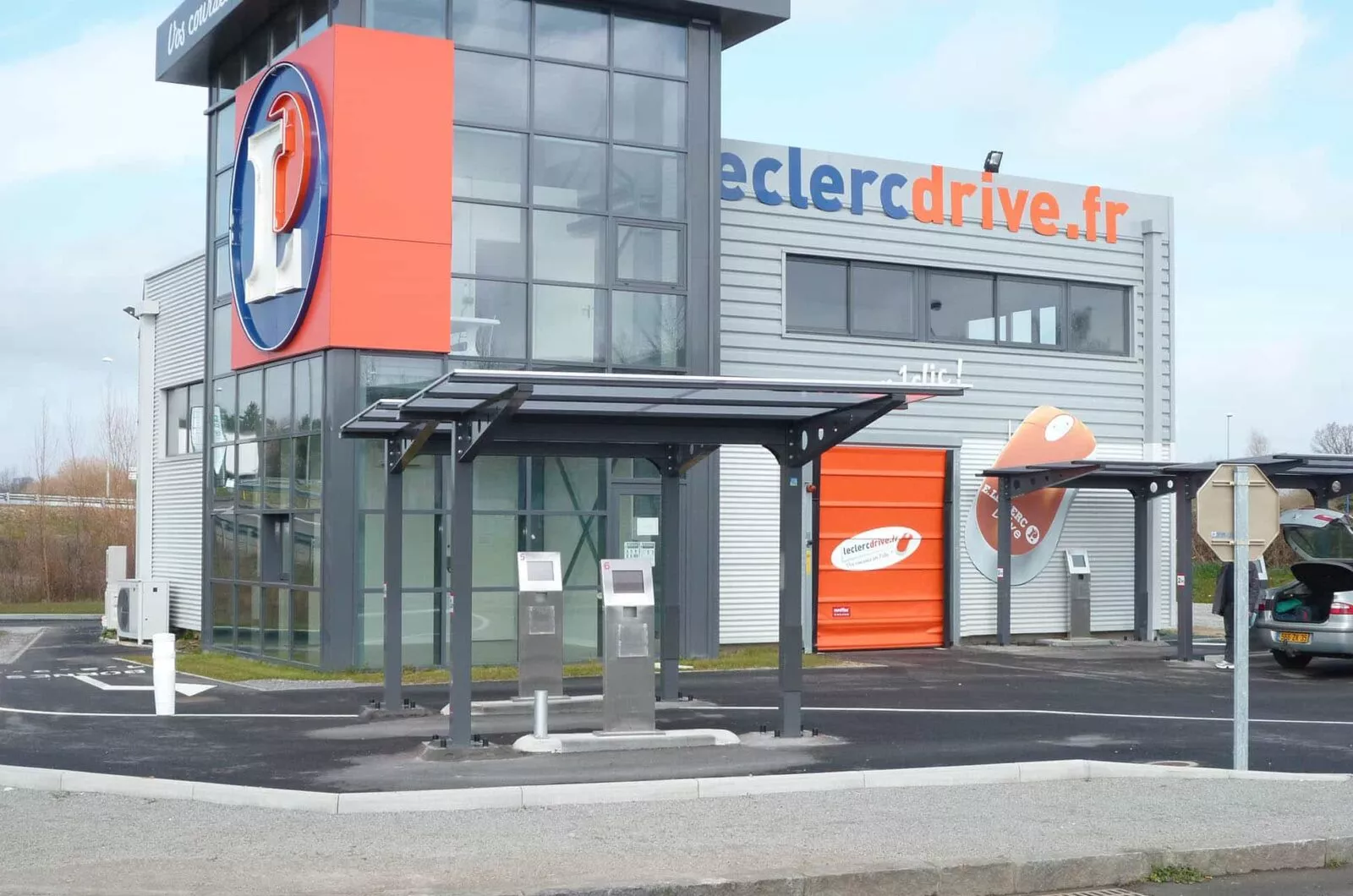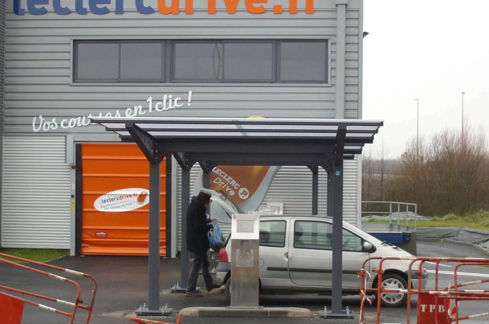 Les auvents Drive protègent les bornes de retrait et les clients des intempéries lorsqu’ils viennent récupérer leurs courses.