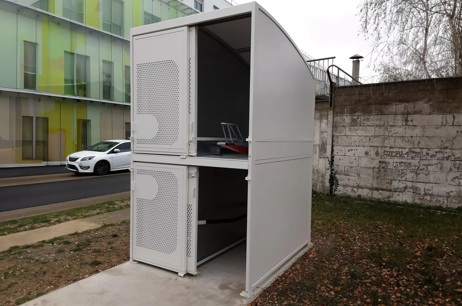 Ce box à vélos à étage existe avec des portes battantes ou coulissantes.