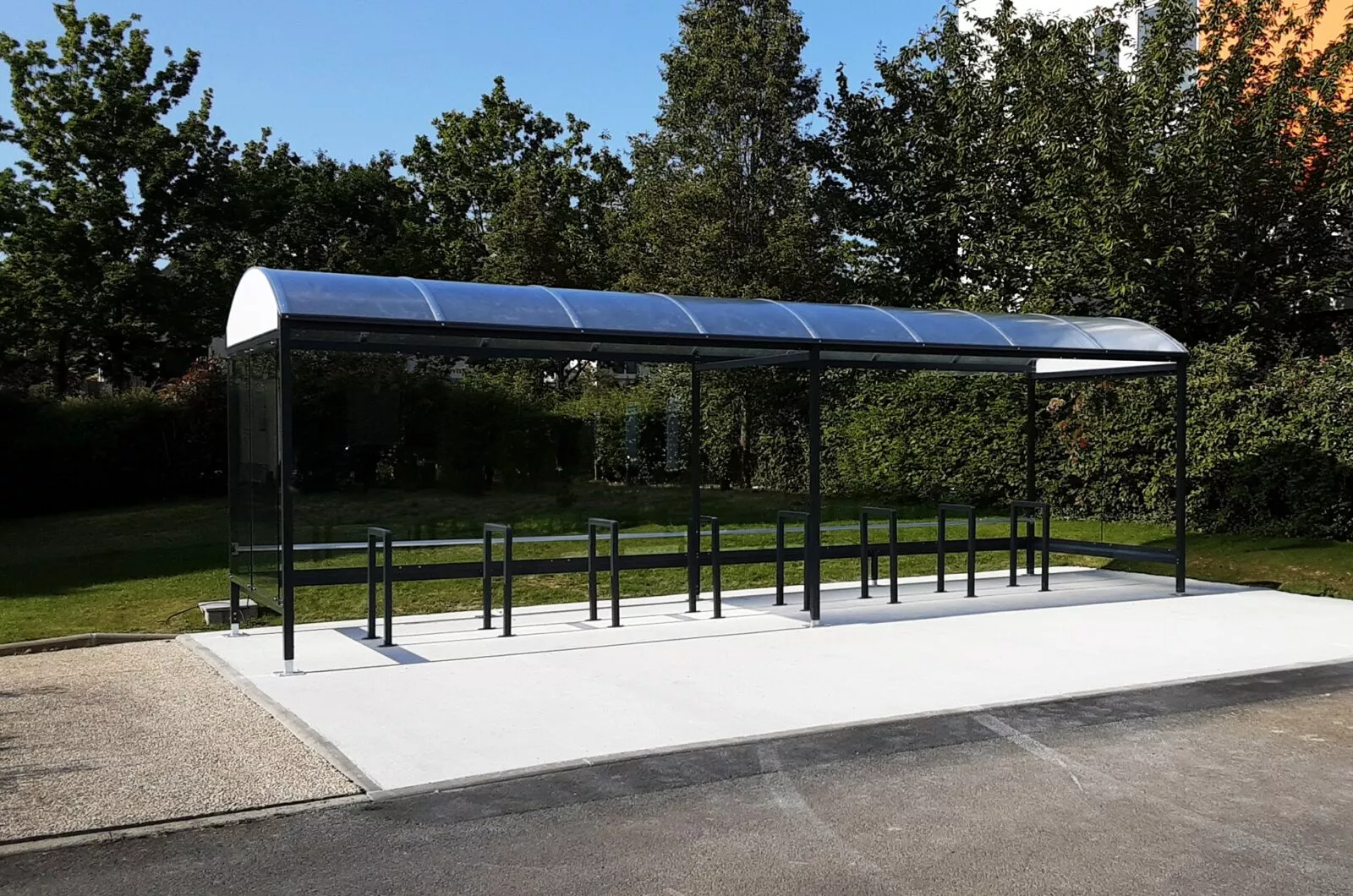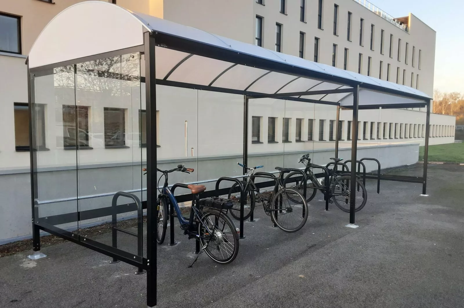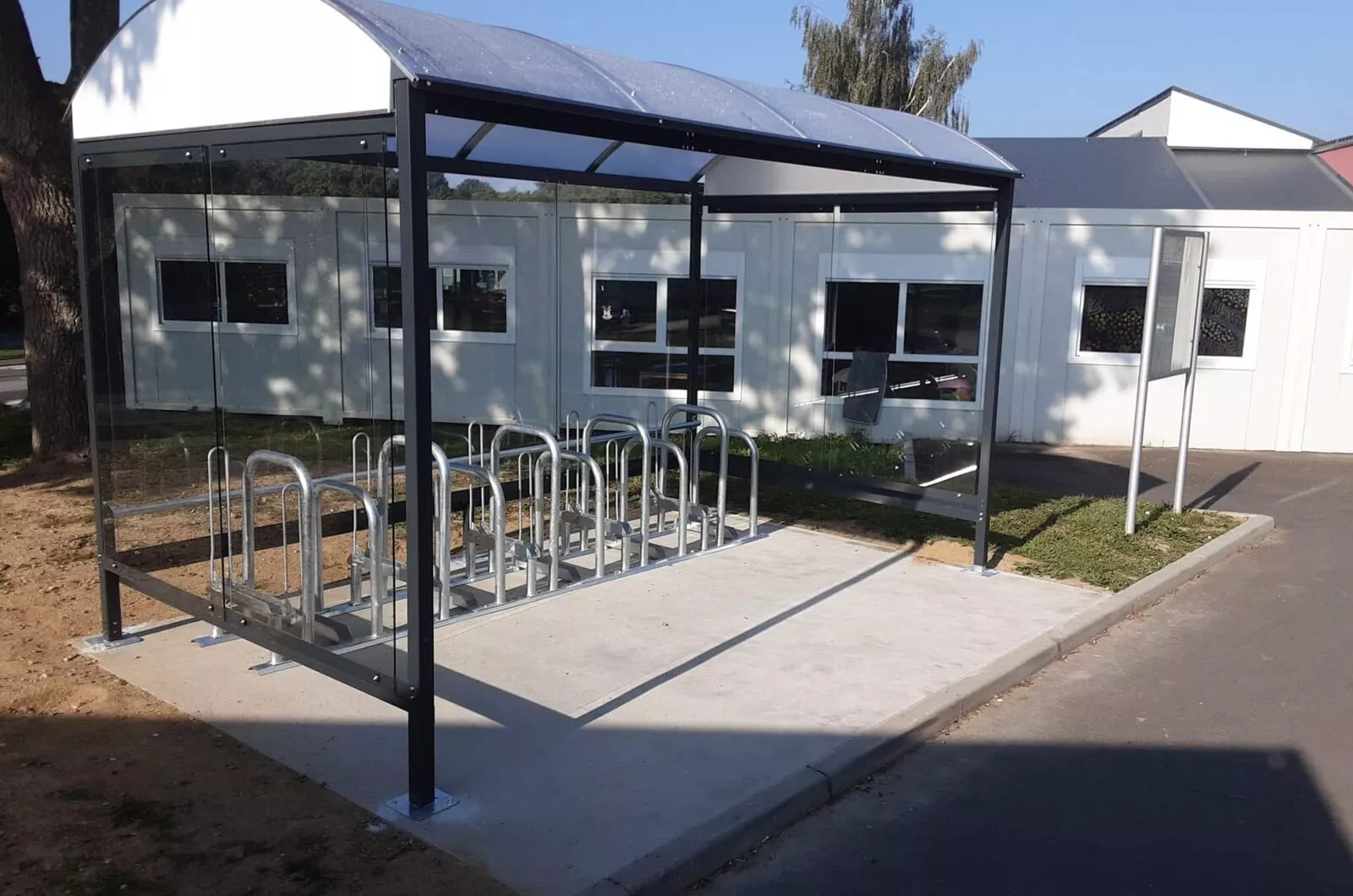 Modulable, l’abri vélos COMBRAILLES protège vélos et VAE. Pour le bien-être des utilisateurs, il est conseillé d’accessoiriser l’abri de bornes vélos ou de borne de recharge VAE.