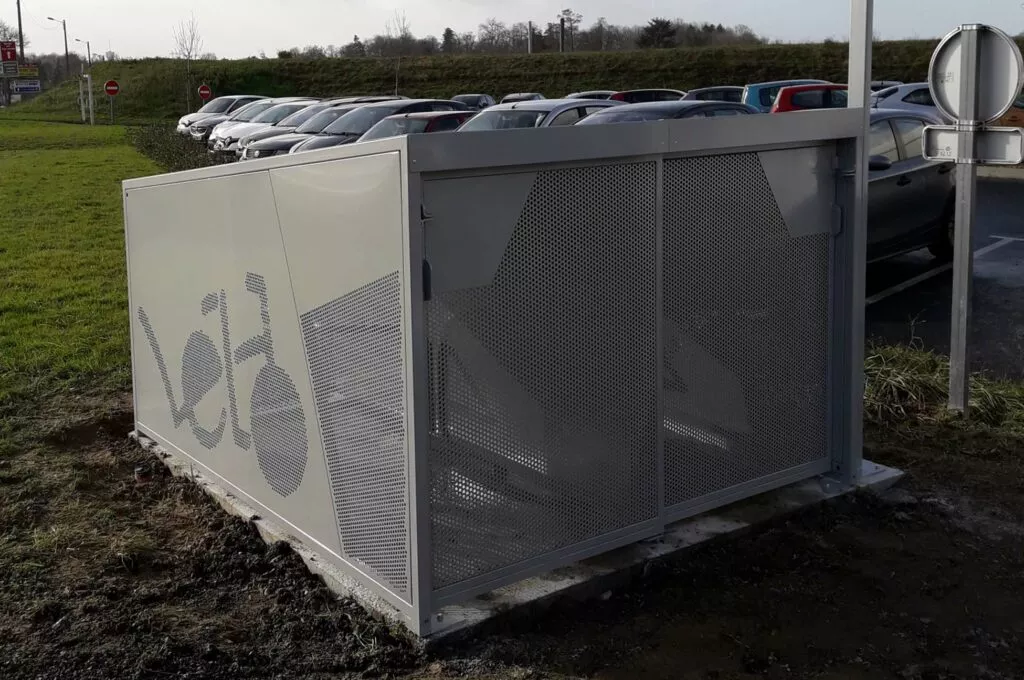 L’option signalétique adhésive pour abri ou le mât signalétique sont pratiques pour communiquer via ce garage à vélo individuel !
