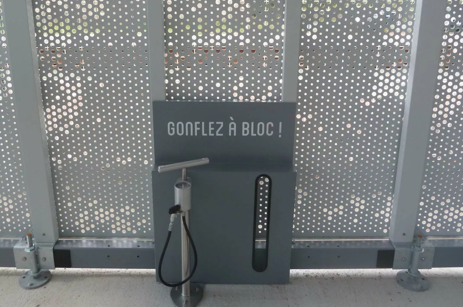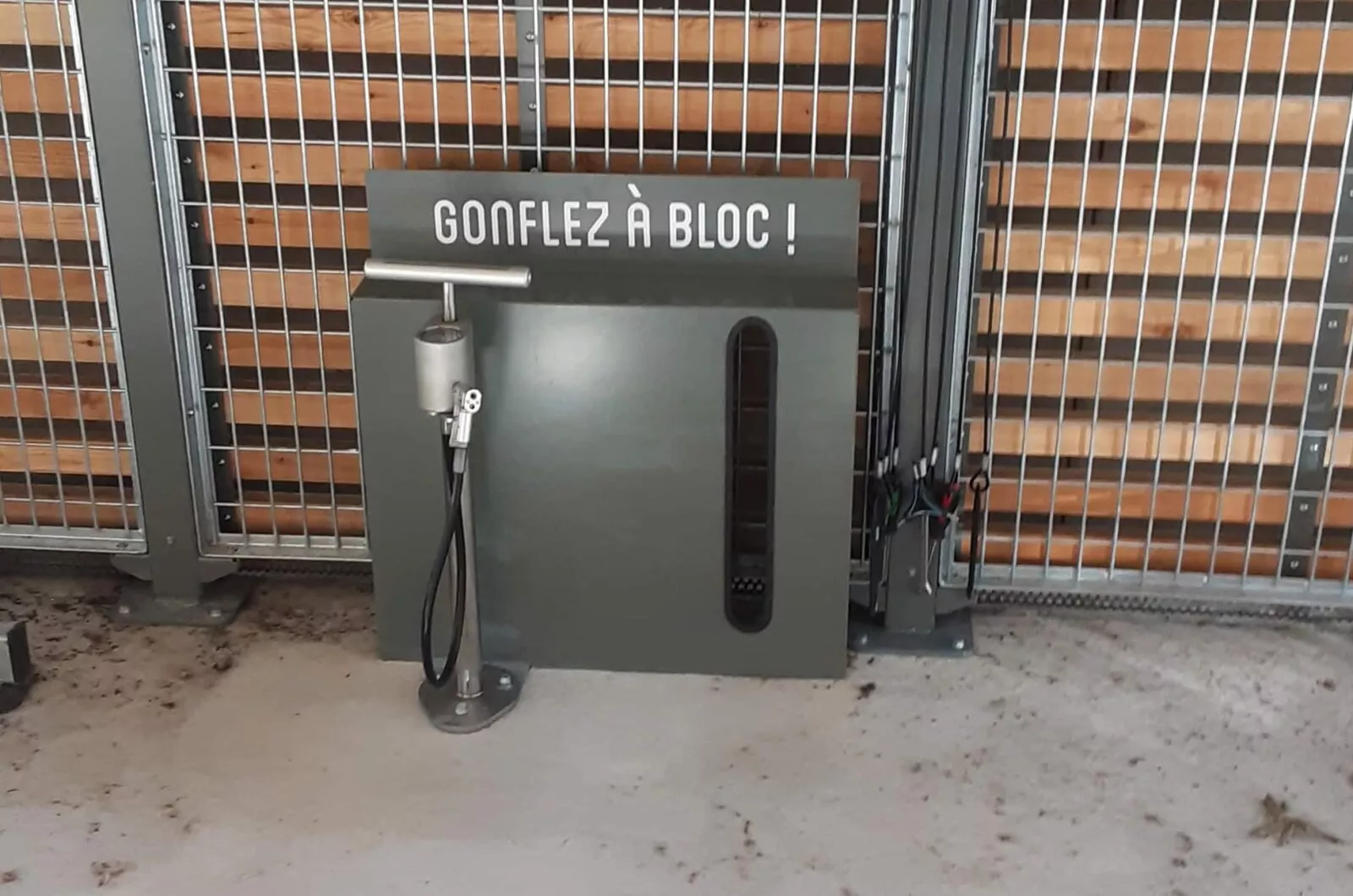La station de gonflage pour parking à vélos, Gonflez à bloc, est un équipement d’entretien prévu pour une utilisation en extérieur comme en intérieur et se place contre l’une des parois de l’abri vélos.