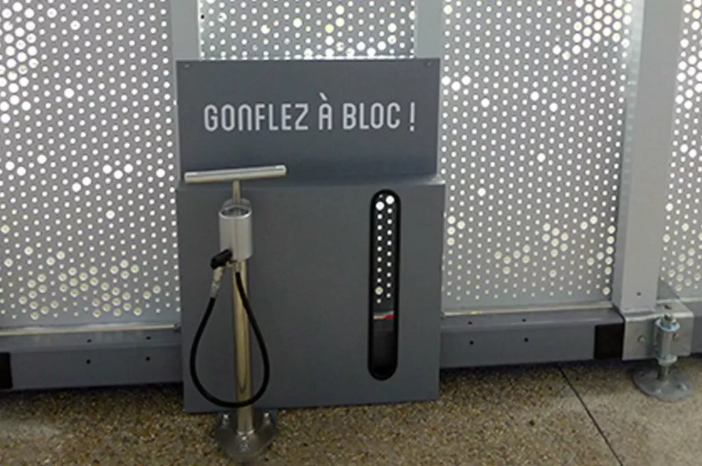 La station de gonflage pour parking à vélos, Gonflez à bloc, est un équipement d’entretien prévu pour une utilisation en extérieur comme en intérieur et se place contre l’une des parois de l’abri vélos.