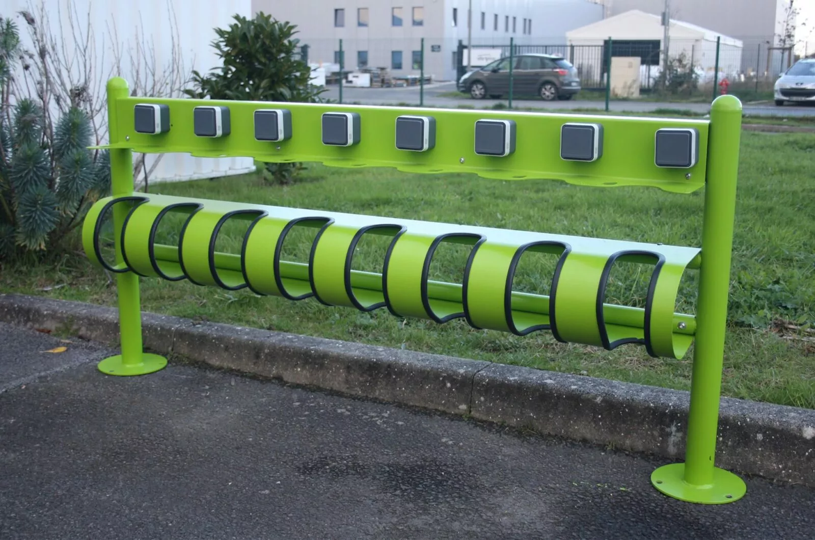 Sa conception permet de pour pouvoir stationner et sécuriser facilement sa trottinette avec son antivol sans l’abimer, grâce aux caoutchoucs de protection. Des prises peuvent être ajoutées au support afin de recharger les trottinettes électriques.