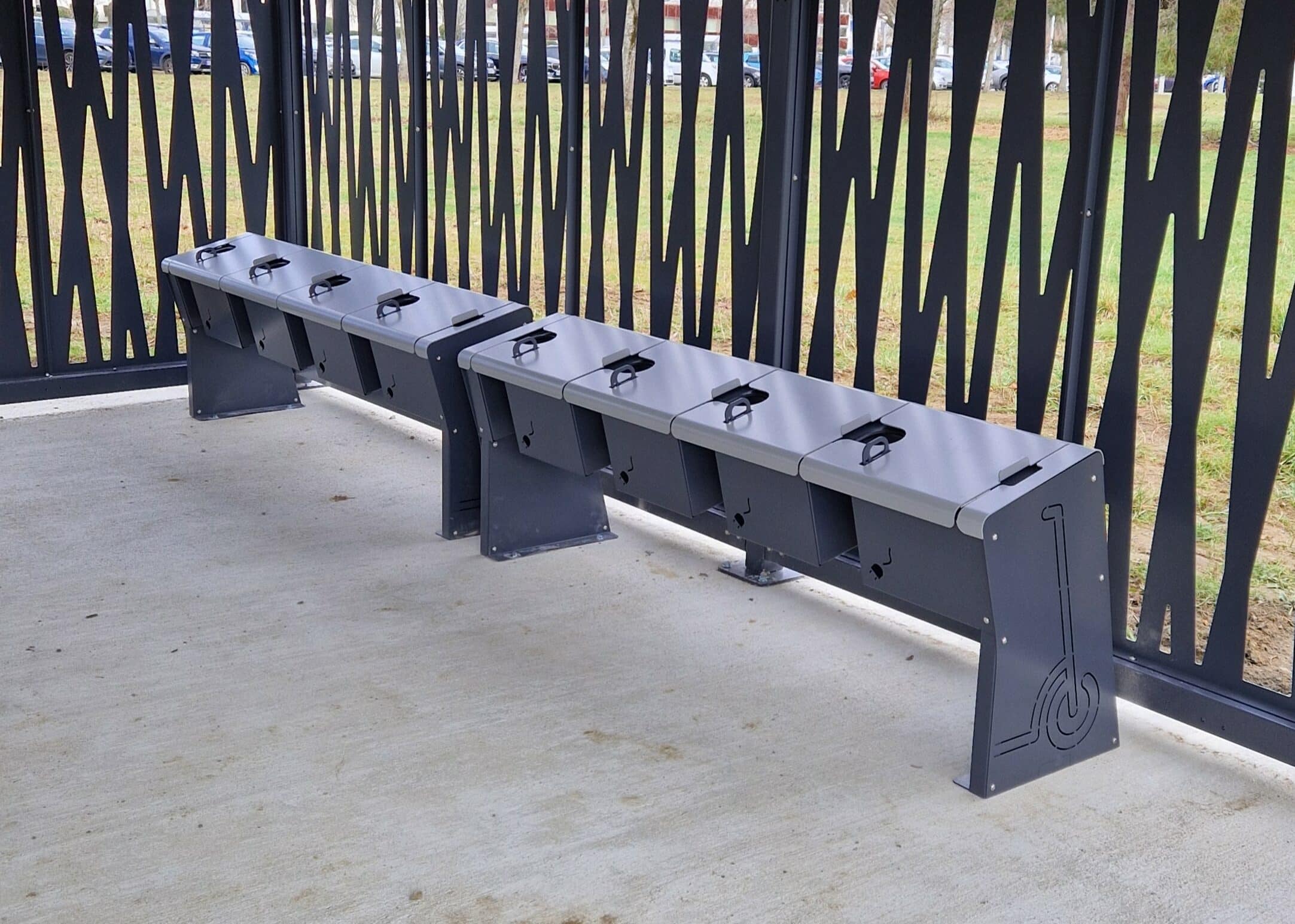 Dernière-née de notre équipe innovation, la station de recharge Trot-e-Park permet de stationner jusqu’à 4 trottinettes électriques en même temps. Mieux encore, chaque emplacement est doté d’un casier avec prise électrique pour recharger sa trottinette. Ces casiers de rangement sont assez grands pour offrir la possibilité d’y déposer son casque, son gilet jaune et toutes ses affaires de transport afin de ne pas s’en encombrer au bureau. Pour faciliter la sécurisation, la fermeture de la trappe permet de sécuriser les effets personnels et la trottinette en un seul point d’accroche, par un antivol (de type menottes par exemple) ou par un cadenas.